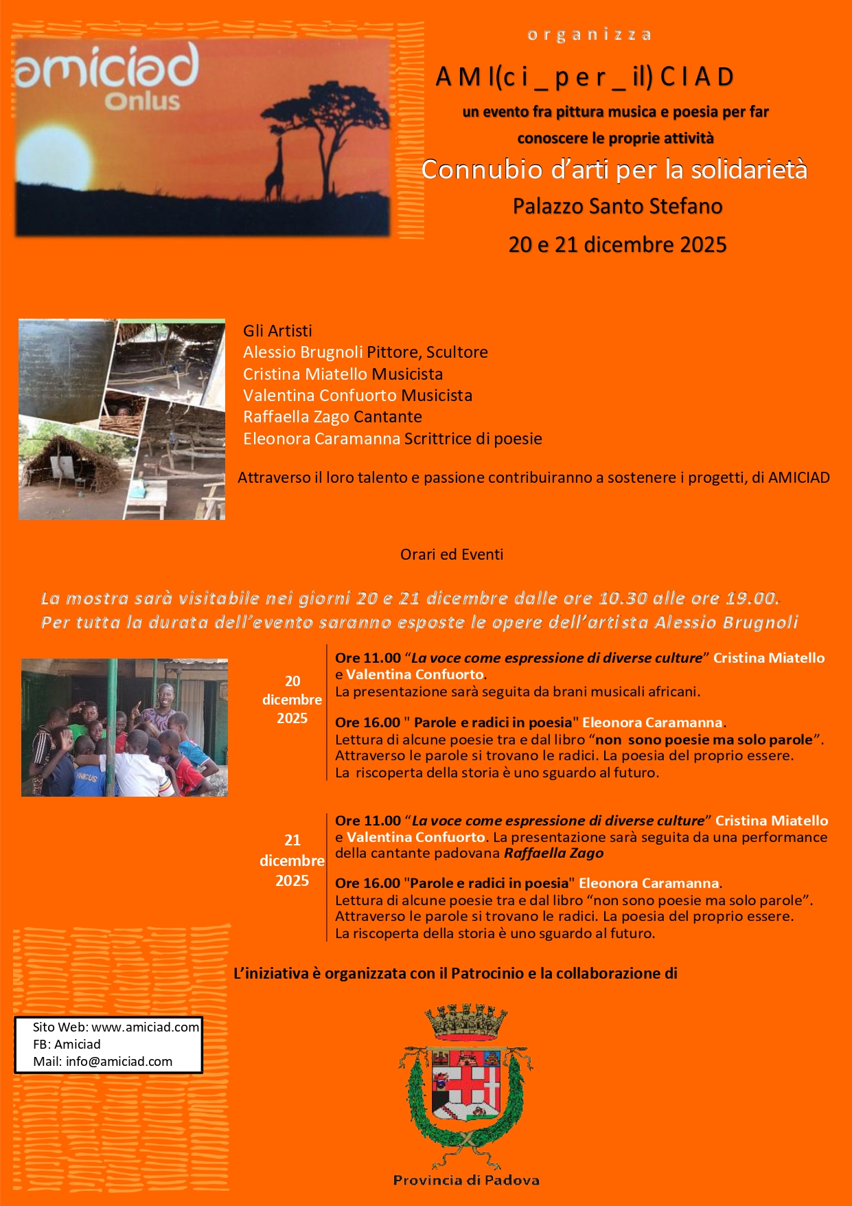 Inaugura venerdì 19 dicembre alle ore 17 “Ami(ci-per-il)Ciad”, l’evento che coniuga pittura, musica e poesia ospitato a palazzo Santo Stefano dalla Provincia di Padova che patrocina e collabora alla proposta culturale, e l’associazione Amiciad onlus.