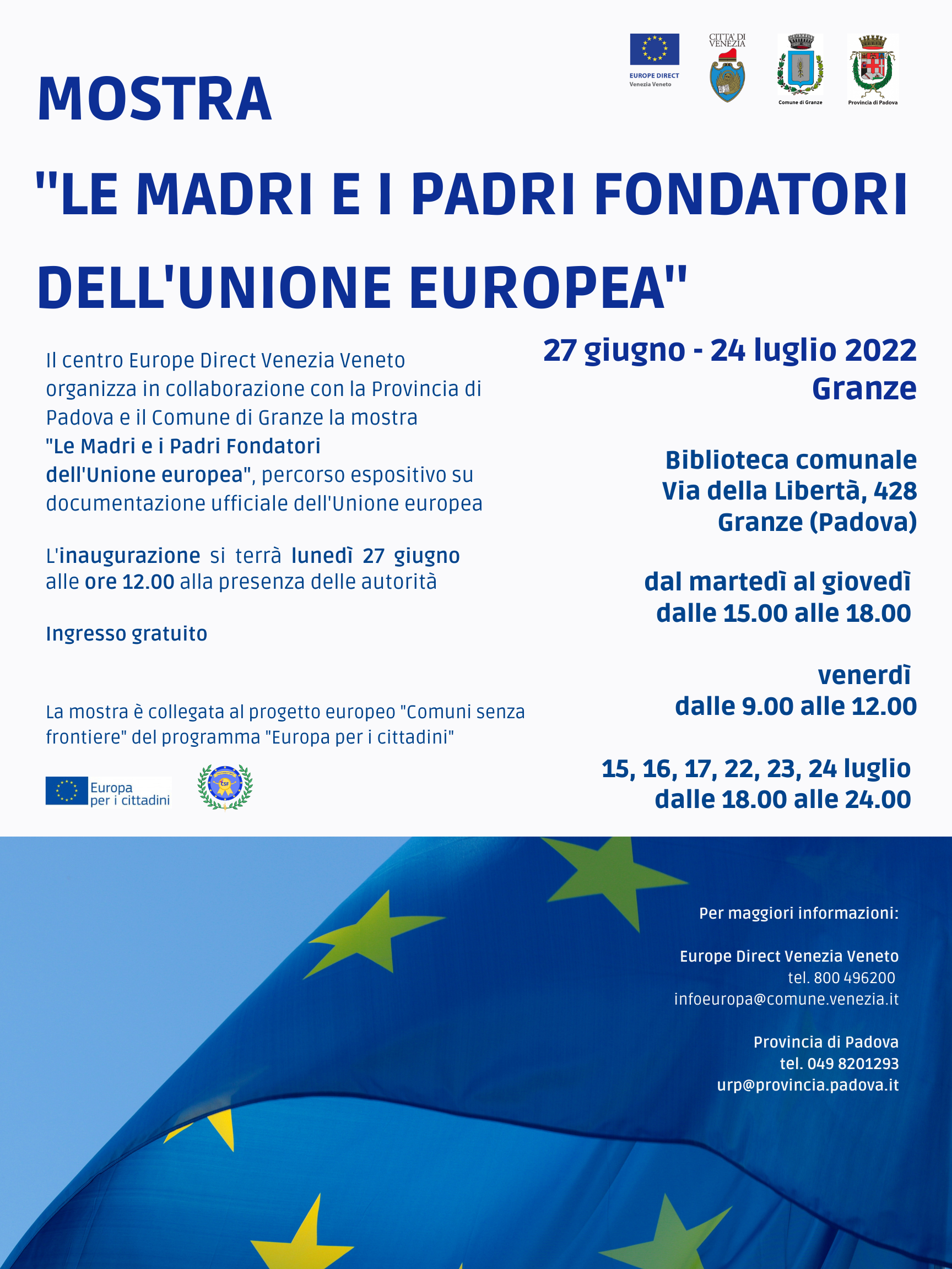 Dal 27 giugno al 24 luglio Granze ospita alla biblioteca comunale la mostra “Le madri e i padri fondatori dell’Unione Europea”.