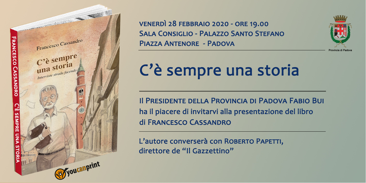 Il nuovo libro di Francesco Cassandro dal titolo “C’è sempre una storia” che doveva esser presentato venerdì 28 febbraio alle 19 nella Sala consiliare della Provincia di Padova (piazza Antenore 3), sarà presentato in data che verrà successivamente comunicata.